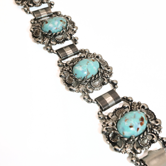 Vintage Silver Tone Turquoise Cabochon Floral Panel Bracelet