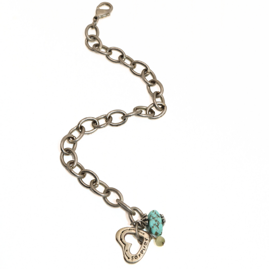 Vintage Silver Tone Heart Charm Bracelet with Turquoise