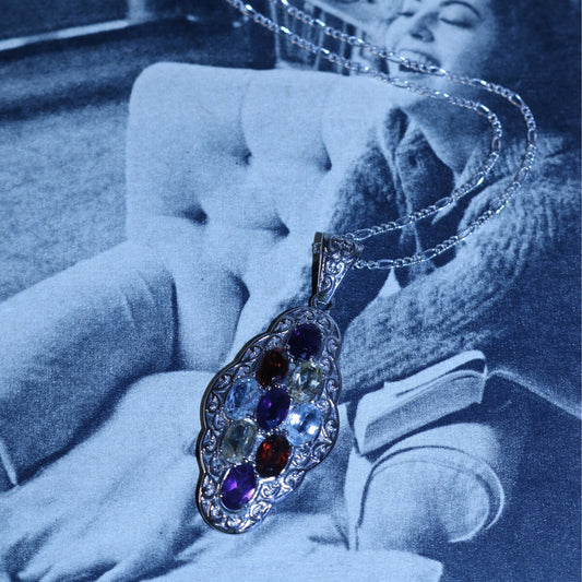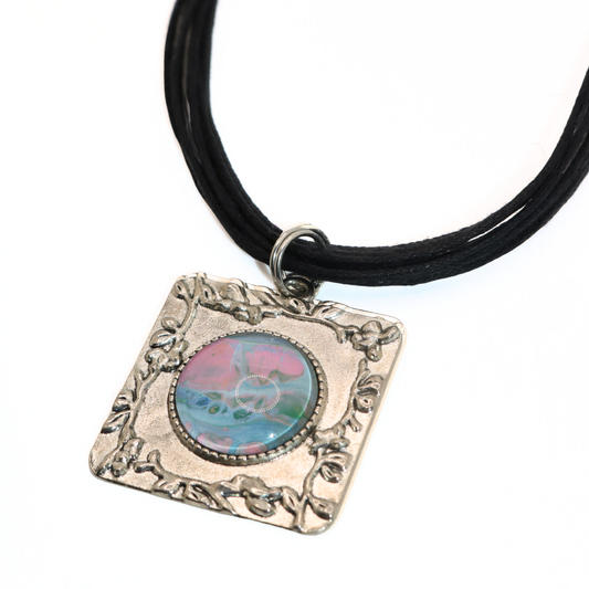 Vintage Silver Tone Floral Frame & Pastel Cabochon Cord Necklace