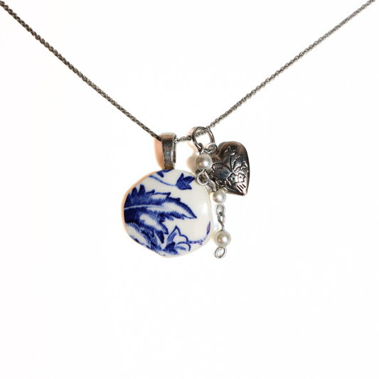 Blue & White China Plate Pendant Necklace with Heart & Pearl Accents