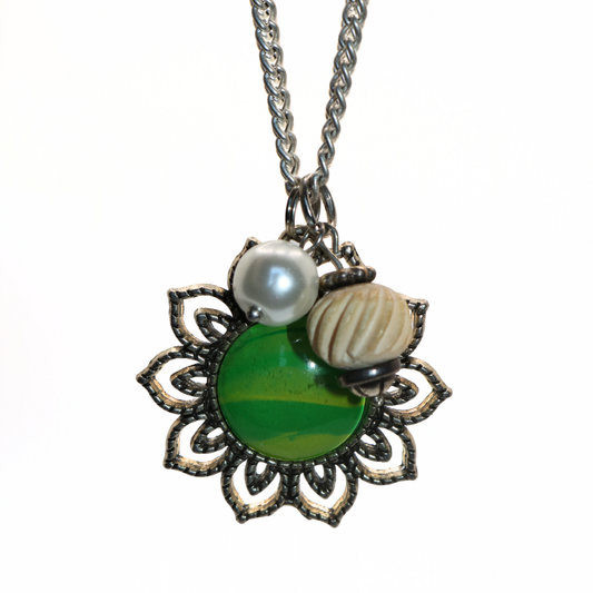 Vintage Reworked Mandala Flower & Green Cabochon Charm Necklace