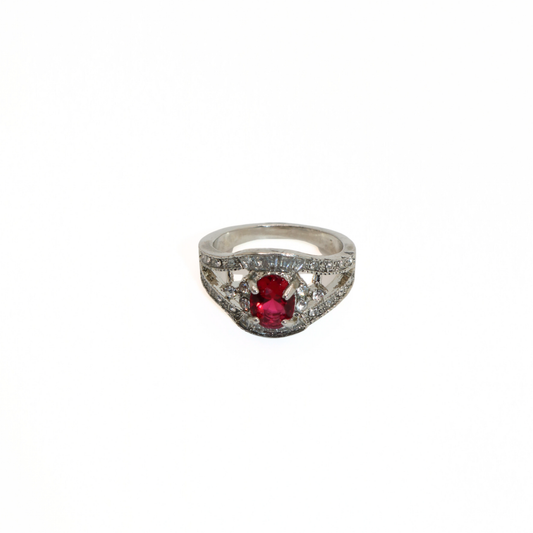 Vintage Silver Tone Red Crystal Art Deco Cocktail Ring