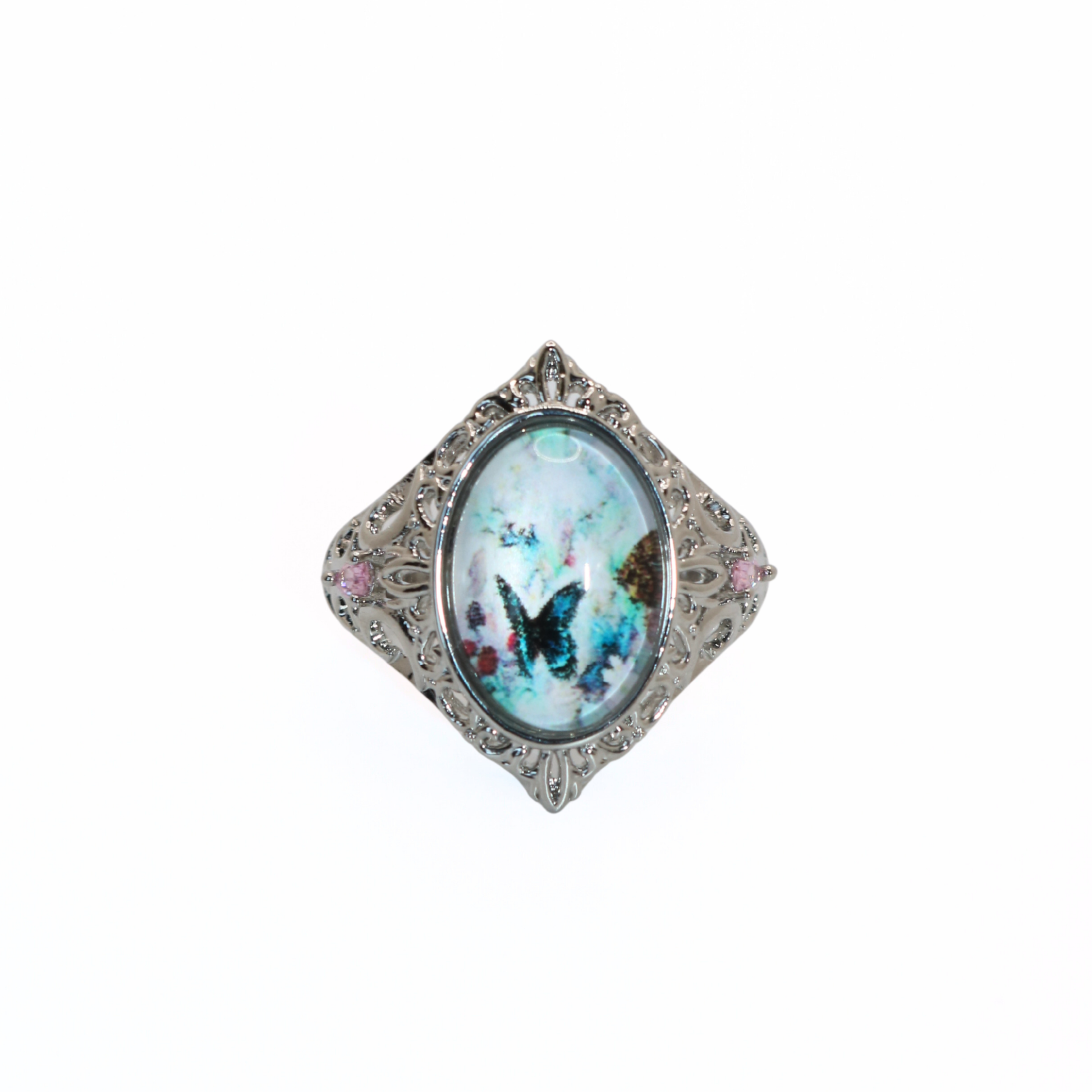 Silver Tone Butterfly Cameo Filigree Ring