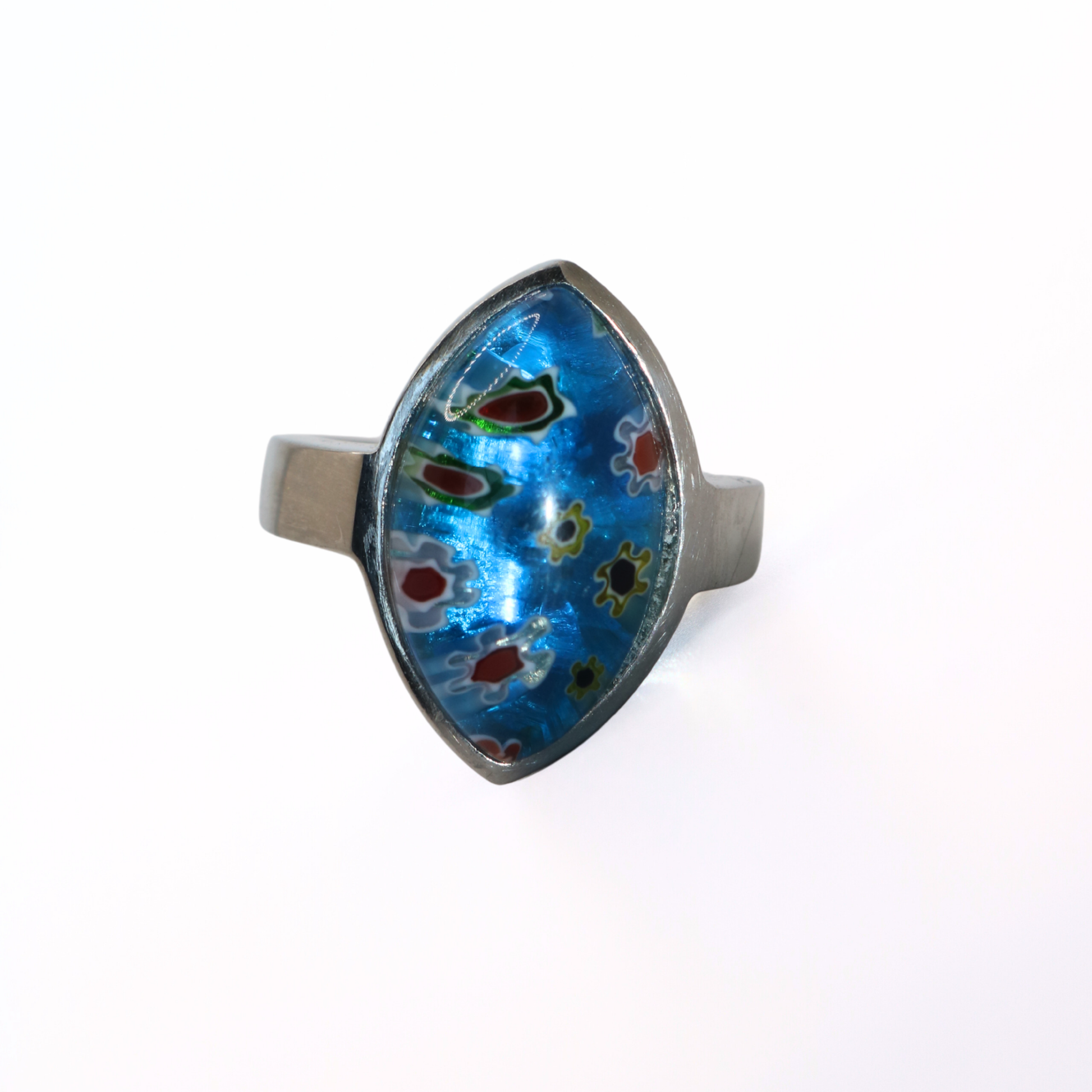 Vintage Silver Tone Blue Millefiori Glass Marquise Ring